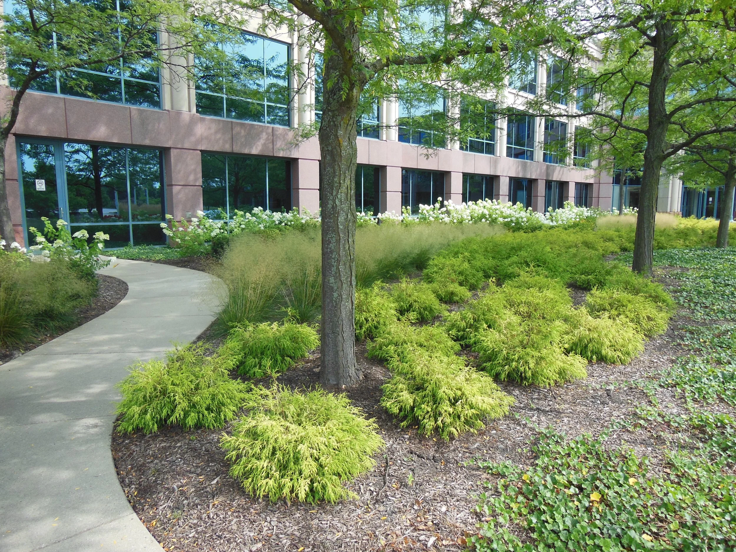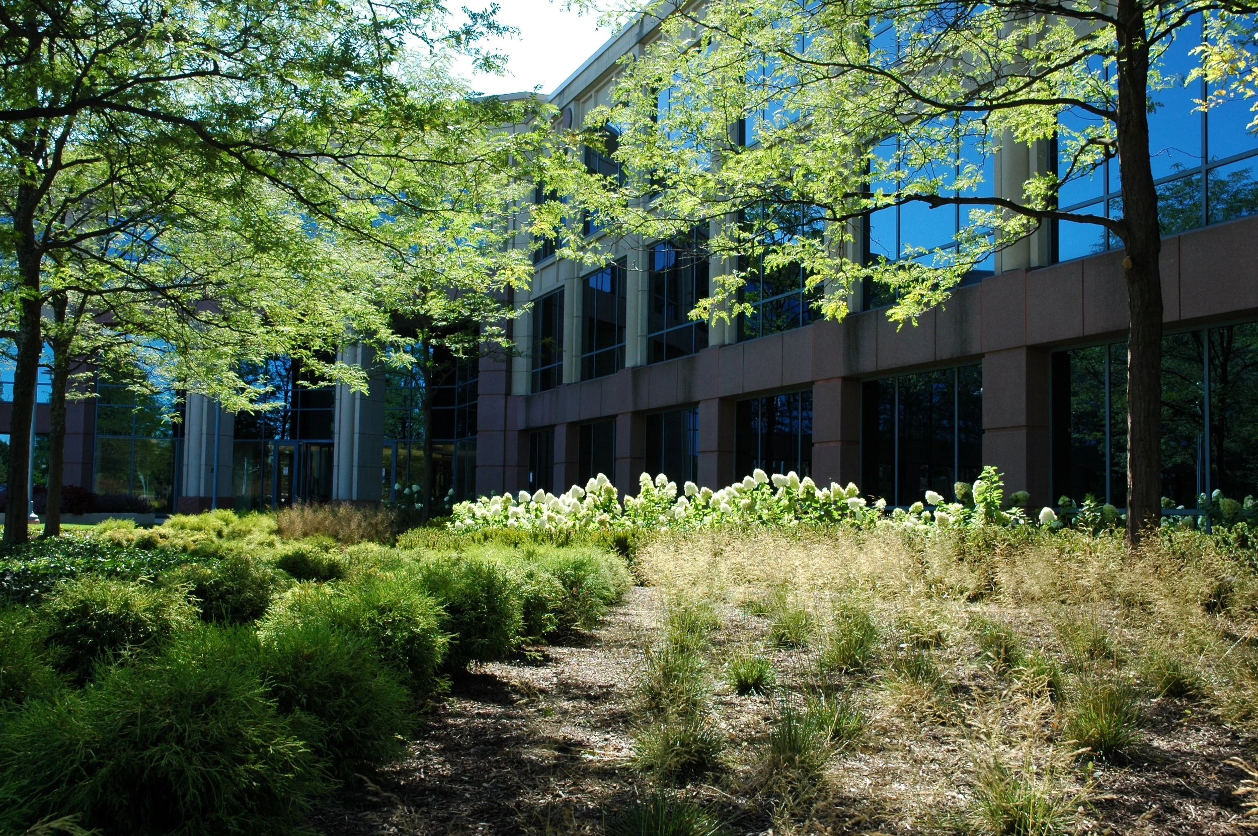 PSLA designed a new entrance walk and planting for both main entrance areas of this corporate office building. Incorporating the existing mature trees, a layer of flowering shrub, evergreen, grass and groundcover created a bold planting for employees and visitors as they enter the building. The new paving design and materials complement the existing architecture and offer all entering the building a colorful seasonal display.